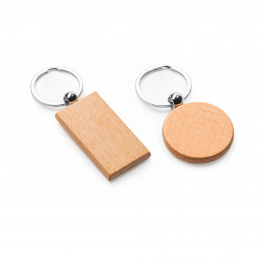 Portachiavi in legno naturale. Dimensioni: cerchio (0,6 x ø 3,9 cm) rettangolo (3 x 0,6 x 5cm). Confezione in polybag.