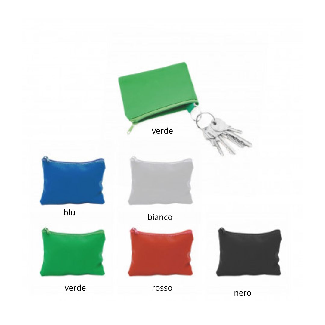 Portachiavi portamonete. Borsa con zip e tiretto in tinta. In PU Termovirante, aria di stampa max cm 7 x 4 con stampa in serigrafia monocolore. Grafica fornita dal cliente o richiedere bozza fornendo il logo in alta qualità o in vettoriale, inoltre indicare colore preferito e colore di stampa.