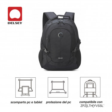 Zaino in poliestere con scomparto anteriore con organizer ,scomparto imbottito per computer. Cinghie di compressione, compatibile con il sistema TROLLEY, due ampie tasche frontali, tasca in rete porta bottiglie, manico superiore.