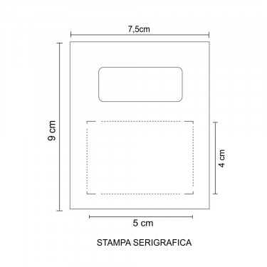 Aria di stampa CM 5 X 4 cm in serigrafia monocolore, (per stampa multicolor richiedere info). Grafica fornita dal cliente o richiedere bozza fornendo il logo in alta qualità o in vettoriale, inoltre indicare colore preferito e colore di stampa.