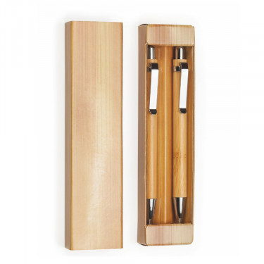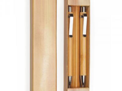 Set bamboo . Penna refil nero + matita. Clip in metallo. Confezione in astuccio cartone effetto legno.