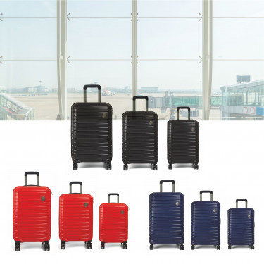 Set 3 valige da viaggio in polipropilene con 4 ruote, targhettain metallo personalizzabile, chiusura americana, TSA lock, fodera nera interna. Dimensioni: L: cm 50x78x32 M: cm 43,5x67x31 S: cm 41x57x23.