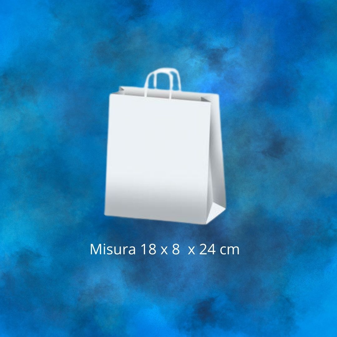 Shopper di carta Kraft misura 18x8x24 con maniche a tortiglioni o piatta di colore bianca, collo da 400 pezzi. La stampa monocolore e su ambo i lati con grafica fornita dal cliente, in caso che bisogna realizzare la grafica e da concordare, i tempi di consegna dopo approvazione grafica vi verrà comunicata. Il prezzo indicato e la quantità e misura riportata, per altri colori dello shopper richiedere se ci sono disponibilità e indicare il colore di stampa.
