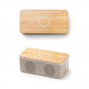 Altoparlante Bluetooth ricarica wireless. Corpo in fibra di grano e superficie in bamboo. Potenza dell’altoparlante 10W.