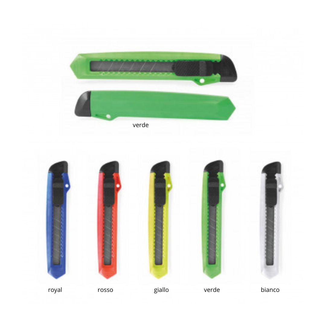 Taglierino a lama larga e corpo in ABS. Impugnatura ergonomica fustellata e cappuccio rimovibile per il taglio e la regolazione della lama.