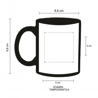 Area di stampa a tampografia/serigrafia e molto piccolo per il tipo di forma dell'oggetto oltre ad essere monocolore, con un'area di stampa di cm 5x5 in monocolore.