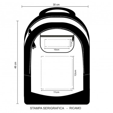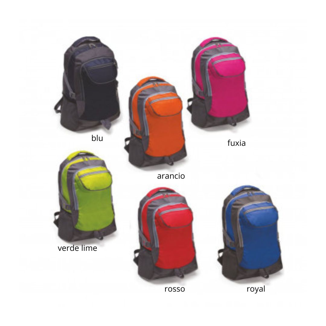 Zaino backpack in poliestere 600D. Porta computer 15”. Doppio scomparto con zip. Comodo taschino anteriore chiuso da zip. Due tasche elastiche laterali. Manico rinforzato. Schienale rinforzato. Tracolle regolabili, imbottite, salva spalle. Interno foderato. Aria di stampa max cm 11 x 12 con stampa in serigrafia monocolore. Grafica fornita dal cliente o richiedere bozza fornendo il logo in alta qualità o in vettoriale, inoltre indicare colore preferito e colore di stampa. Colori: rosso, nero, royal, blu, fuxia, arancio, verde lime. Confezione in polybag. Dimensioni: cm 30x46x15 Il prezzo indicato e per un pezzo compreso stampa, con un minimo di ordine 35 pezzi, per ordine multipli viene applicato uno sconto.