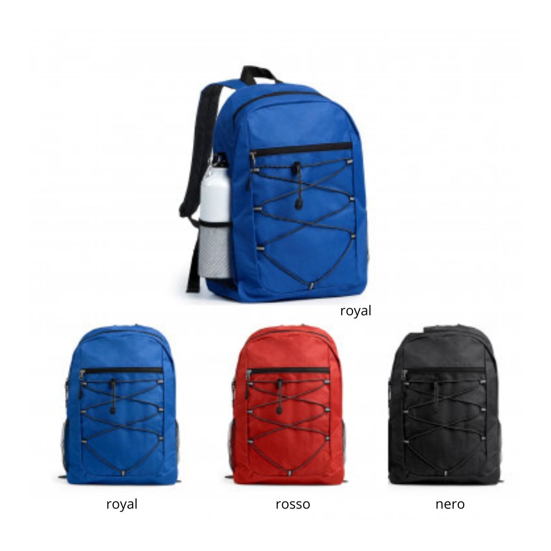 Zaino in poliestere 600D, chiusura con zip, cordino elastico anteriore e tasche laterali in rete. Schienale e spallacci imbottiti. Aria di stampa max cm 20x15 con stampa in serigrafia monocolore. Grafica fornita dal cliente o richiedere bozza fornendo il logo in alta qualità o in vettoriale, inoltre indicare colore preferito e colore di stampa. Colori: royal, rosso, nero Dimensioni: cm 30x45x14 Il prezzo indicato e per un pezzo compreso stampa, con un minimo di ordine 40 pezzi, per ordine multipli viene applicato uno sconto.