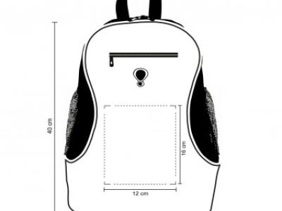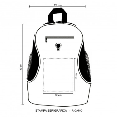 Zaino in poliestere 600D. Chiusura con zip. Tasca frontale con uscita auricolari chiusa da zip. Corredato di manico rinforzato. Tracolle salva spalle regolabili. Taschini laterali a rete.