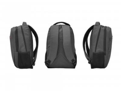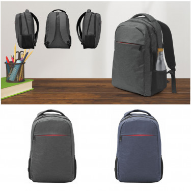 Zaino portacomputer in poliestere con finitura mélange. Spallacci, schienale e manici imbottiti. Doppio scomparto anteriore e tasche laterali.